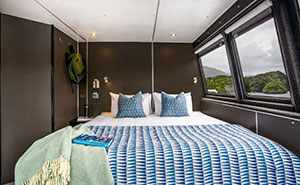Cabins are designed for luxury and privacy: the Governor Cabin offers a super-king bed and full-width forward windows; Captain Cook Cabins feature super-king beds with sea views; Endeavour Cabins have king single beds; and Resolution Cabins include twin single bunks. The Fiordland Jewel also carries a tender and eight kayaks, making it ideal for private charters, overnight Milford Sound cruises, and small-group scenic expeditions.