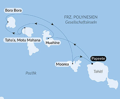 The perfect introduction to the charms of the South Pacific, you will be dazzled by the incomparable beauty of Huahine, by the turquoise waters of the Motu Mahana, Paul Gauguins private vanilla-scented paradise, by the sumptuous lagoon of Bora Bora, with its distinctly recognisable volcanic silhouette, and by Moorea, with its hillside pineapple plantations and its verdant peaks overlooking the island.